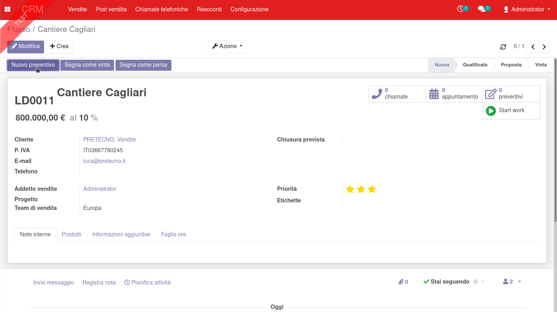 Dalle opportunità è possibile creare da queste uno o più preventivi. In questo modo si tiene traccia di quanti preventivi sono stati generati da un'opportunità e di conseguenza si verifica la redditività della stessa e del team di vendita collegato.