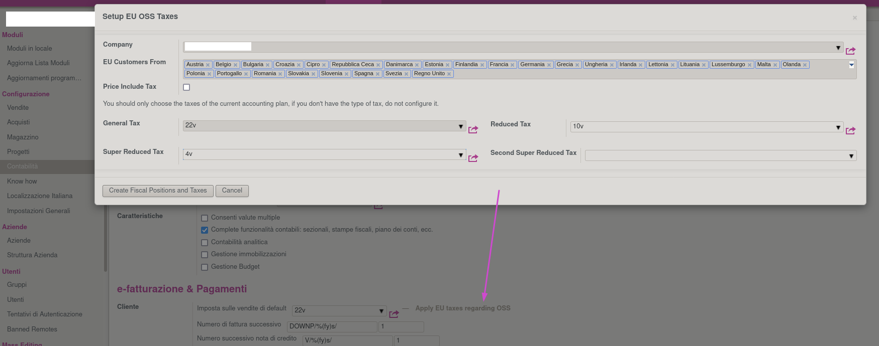 Si procede quindi a creare le imposte per i paesi in cui abbiamo necessità di fatturare verso privati in Configurazione > Contabilità cliccando sull'azione Apply EU taxes regarding OSS: