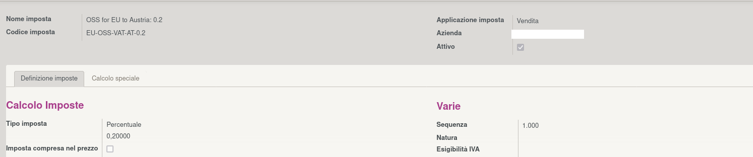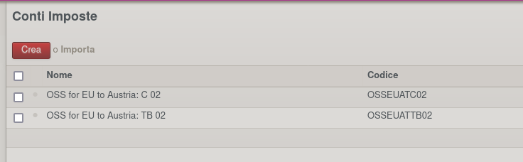 Cliccando quindi su Create Fiscal Position and Taxes verranno generate le imposte ed i conti imposta con la percentuale corretta di quel paese (conosciuta in fase di installazione del modulo) e la posizione fiscale. Ecco quindi i Conti Imposte generati per l'Austria: