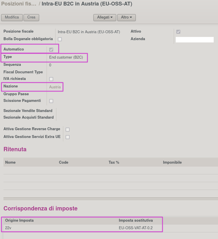 e la Posizione Fiscale, in cui si notano il flag Automatico attivo, che combinato alla Nazione e al Tipo di cliente privato, permettono al sistema di applicare in automatico questa posizione fiscale e la relativa imposta ai clienti privati austriaci: